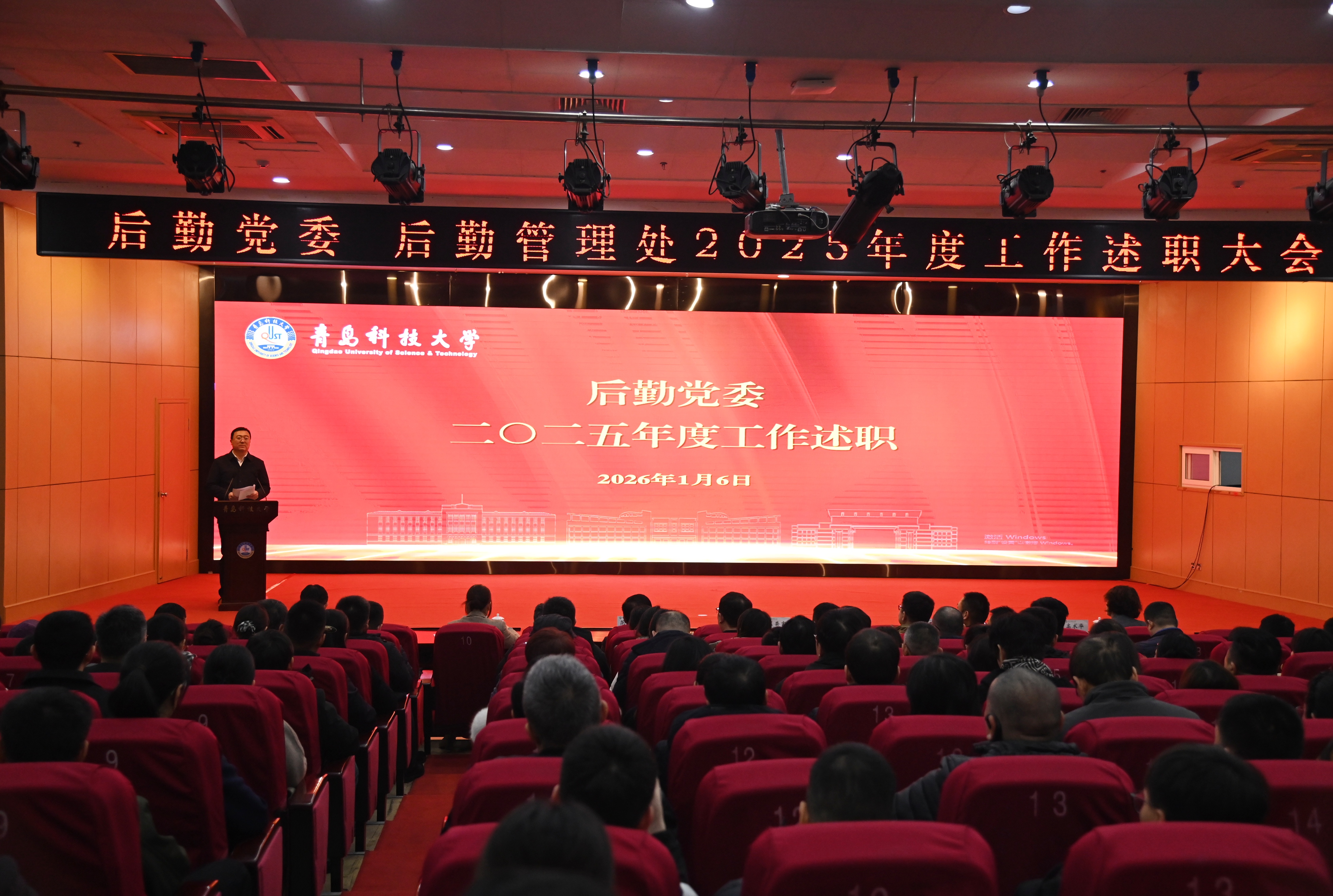 为深入贯彻落实党的二十大和二十届四中全会精神,全面总结2025年度工作成绩,进一步推动后勤工作提质增效,1月6日下午,后勤党委、后勤管理处2025年度工作述职大会在崂山校区第三报告厅举行。后勤党政班子成员及全体后勤职工参加会议。后勤管理处处长兼后勤党委书记匡荣富主持大会。